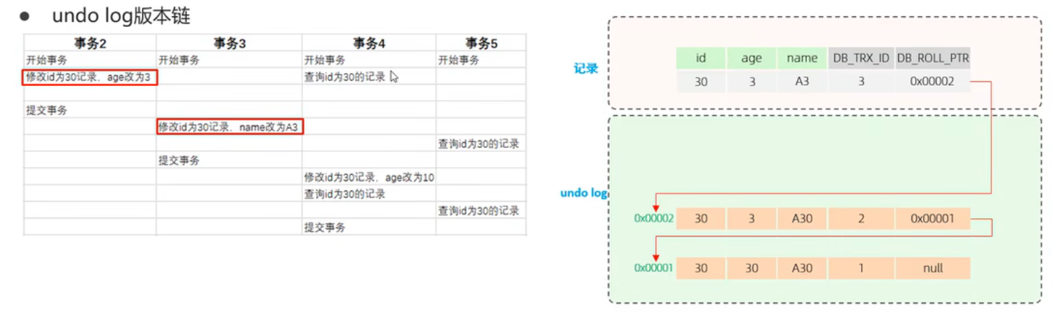 不同事务或相同事务对同一条记录进行修改,会导致该记录的undo log生成一条记录版本链表,链表的头部是最新的旧记录,链表尾部是最早的旧记录。
