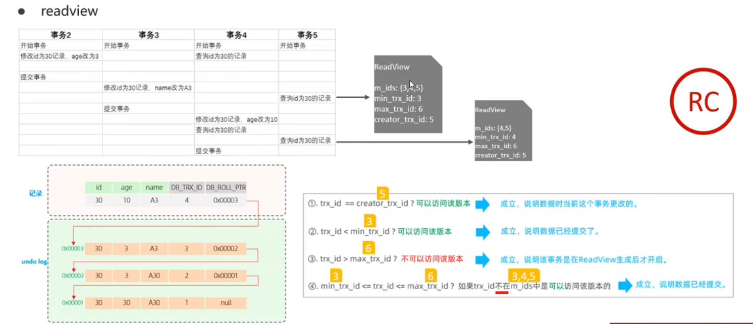 ReadView(读视图)是快照读SQL执行时MVCC提取数据的依据,记录并维护系统当前活跃的事务(未提交的)id。
