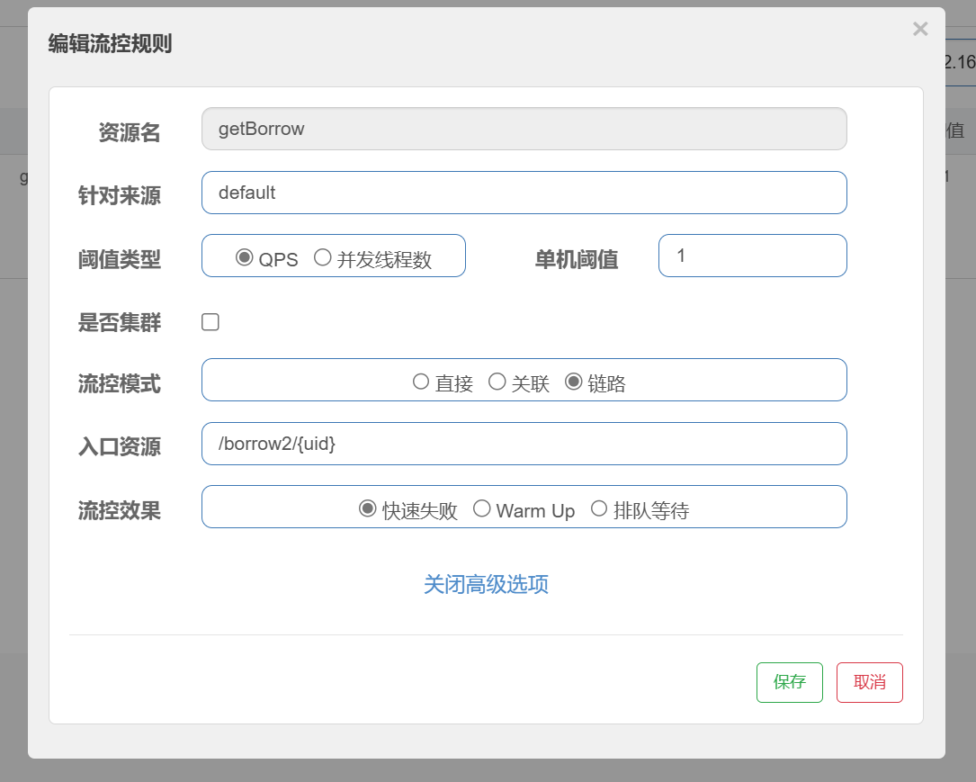 如上图所示,现在只对borrow2/{uid}方法进行限流,borrow/{uid}不受限流影响