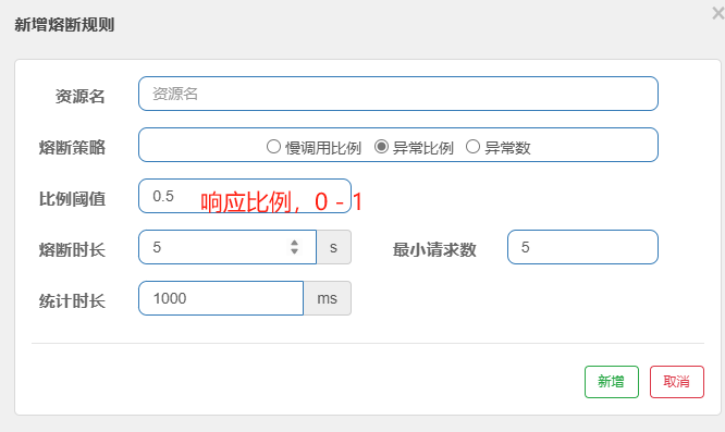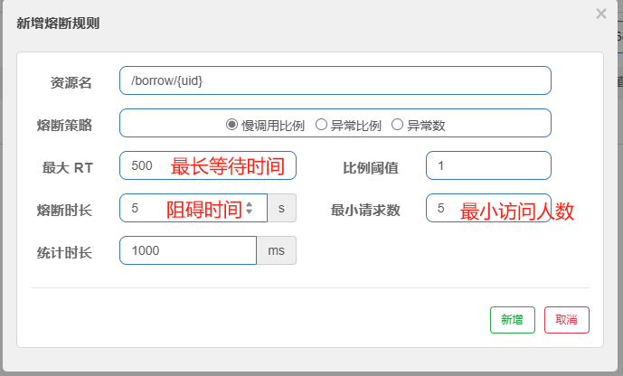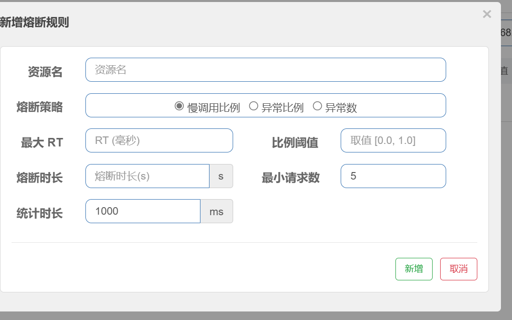 如果出现那种半天都处理不完的调用,有可能就是服务出现故障,导致卡顿,这个选项是按照最大响应时间(RT)进行判定,如果一次请求的处理时间超过了指定的RT,那么就被判定为慢调用,在一个统计时长内,如果请求数目大于最小请求数目,并且被判定为慢调用的请求比例已经超过阈值,将触发熔断。经过熔断时长之后,将会进入到半开状态进行试探
