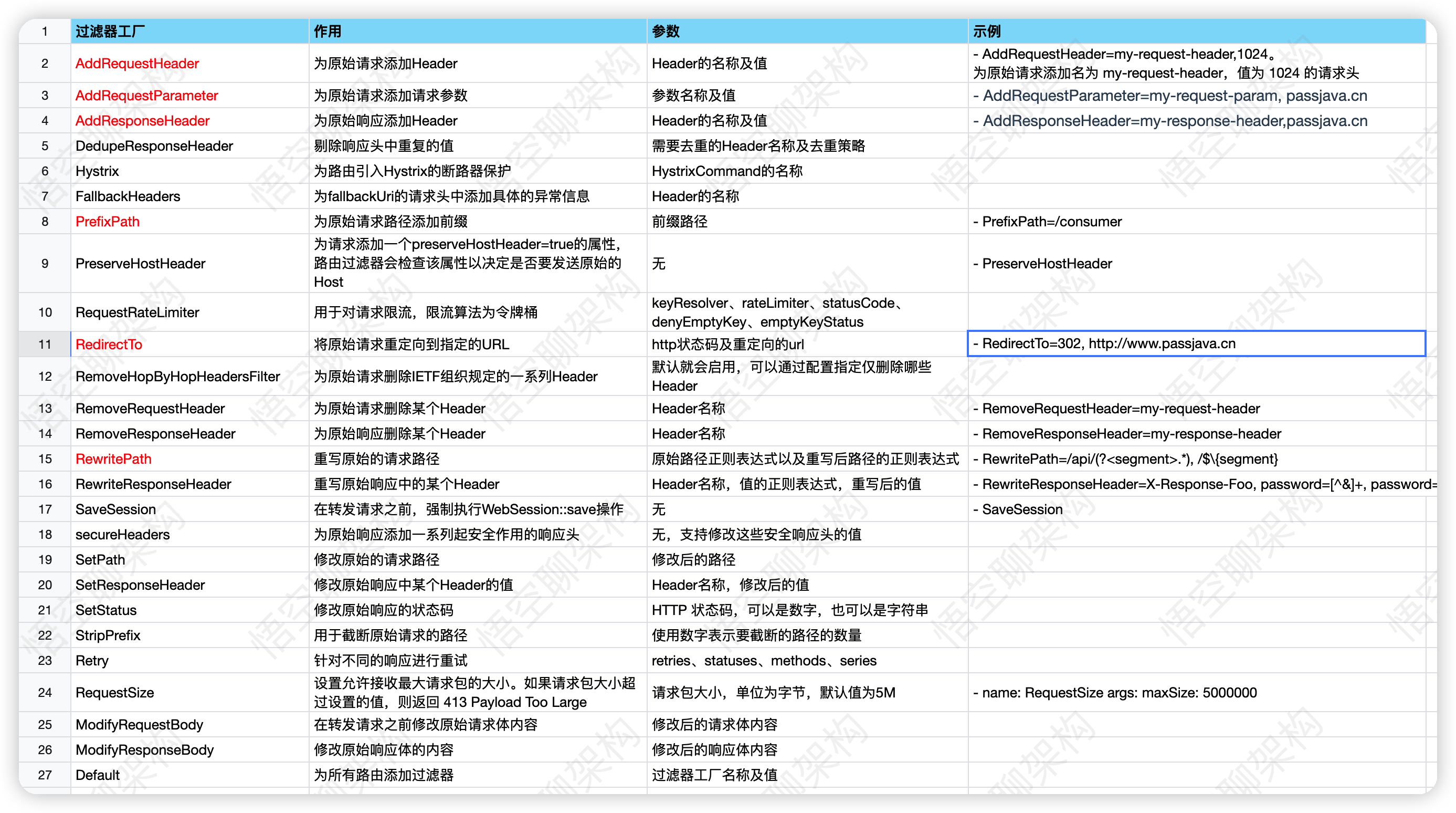 局部过滤器,应用在单个路由或一组路由上的过滤器。标红色表示比较常用的过滤器。