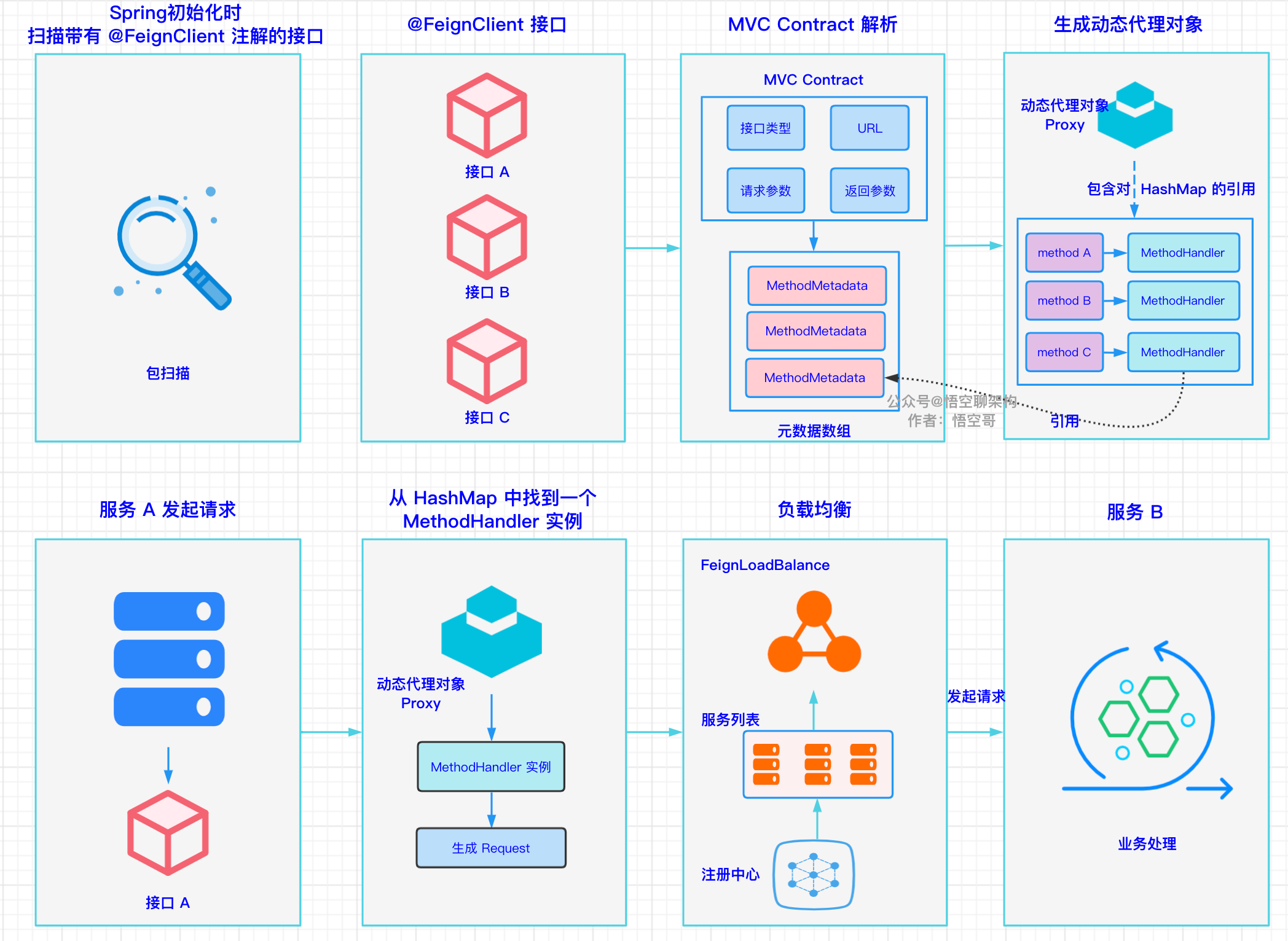 - 1、在 Spring 项目启动阶段,服务 A 的OpenFeign 框架会发起一个主动的扫包流程。
