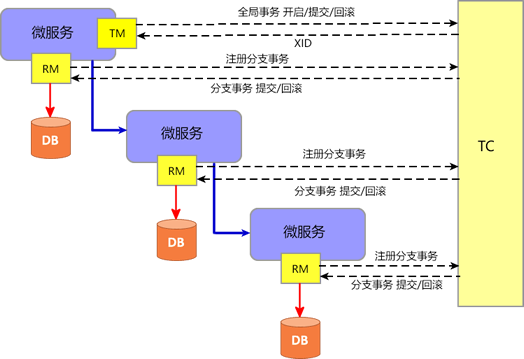 - TM 向 TC 申请开启一个全局事务,全局事务创建成功后,TC 会针对这个全局事务生成一个全局唯一的 XID;
