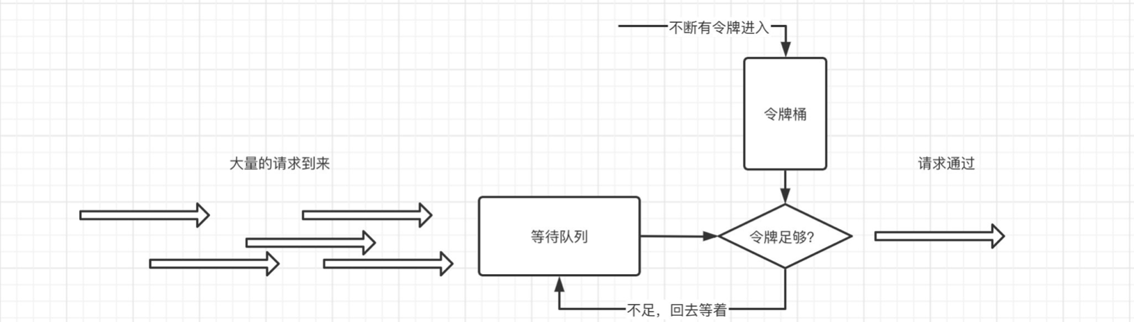 只能说有点像信号量机制。现在有一个令牌桶,这个桶是专门存放令牌的,每隔一段时间就向桶中丢入一个令牌(速度由我们指定)当新的请求到达时,将从桶中删除令牌,接着请求就可以通过并给到服务,但是如果桶中的令牌数量不足,那么不会删除令牌,而是让此数据包等待。