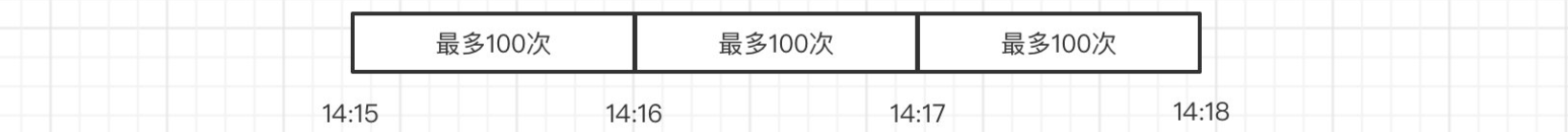 我们可以对某一个时间段内的请求进行统计和计数,比如在14:15到14:16这一分钟内,请求量不能超过100,也就是一分钟之内不能超过100次请求,那么就可以像下面这样进行划分: