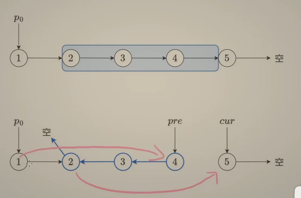 1 2 3 4 5 6 7 8 9 10 11 12 13 14 15 16 17 public ListNode reverseBetween (ListNode head, int left, int right) { ListNode dummy = new ListNode (0 , head); ListNode p = dummy; for (int i = 0 ; i < left - 1 ; i++) p = p.next; ListNode pre = null ; ListNode cur = p.next; for (int i = 0 ; i < right - left + 1 ; i++){ ListNode tmp = cur.next; cur.next = pre; pre = cur; cur = tmp; } p.next.next = cur; p.next = pre; return dummy.next; }