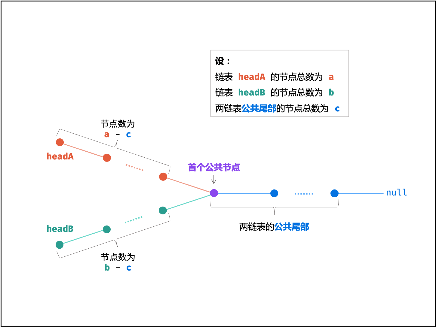 设「第一个公共节点」为 node ,「链表 headA」的节点数量为 a ,「链表 headB」的节点数量为 b ,「两链表的公共尾部」的节点数量为 c ,则有: